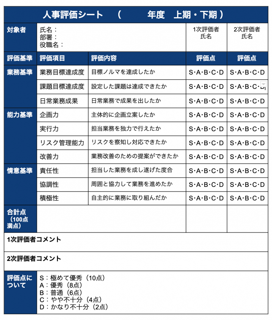人事評価を効果的に行うためには、評価項目の明確化と具体的な記述が不可欠です。評価者は、従業員の業務遂行能力やリーダーシップ能力、コミュニケーション能力など、各項目において客観的な事実に基づいた評価を行う必要があります。特に、評価内容が抽象的にならないよう、具体的な事例を交えて記述することが重要です。