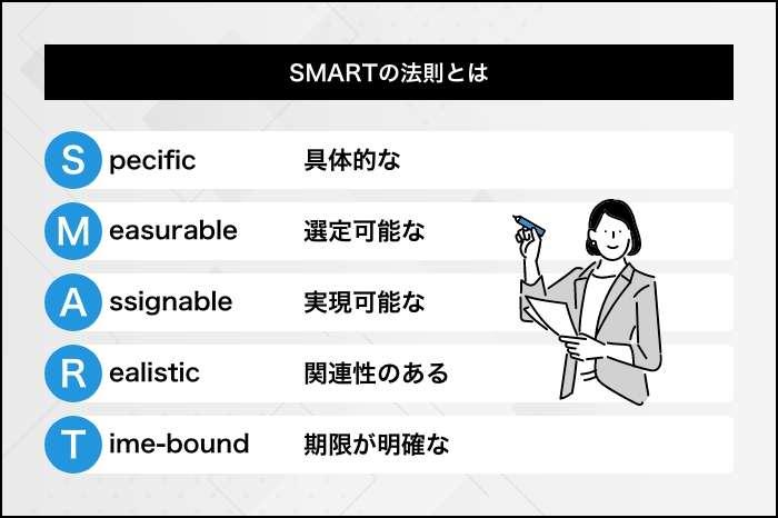 SMART法を使う時は、Specific(具体的)Measurable(測定可能)Achievable(達成可能)Relevant(関連性がある)Time-bound(期限設定)の5要素を必ず満たすことが重要です。特に注意すべきは「達成可能性」で、現実的な範囲で目標を設定しないと挫折の原因になります。また、定期的に進捗を確認し、必要に応じて調整することもポイントです。